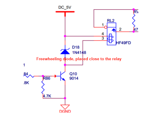 Freewheeling diodes are connected in parallel at both ends of the coil (inductive components), and when the coil passes current, an induced electromotive force will be generated at both ends. When the current disappears, its induced electromotive force produces a reverse voltage on the components in the circuit. When the reverse voltage is higher than the reverse breakdown voltage of the components, it will cause damage to the components such as triode. The freewheeling diode is connected in parallel at both ends of the line. When the current flowing through the coil disappears, the induced electromotive force generated by the coil is consumed by the circuit formed by the diode and the coil. Clump and protect the safety of other components in the circuit. The common circuit structure is as follows.
