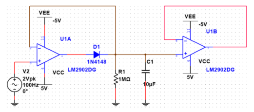 The peak detection circuit detects the maximum value of the input signal amplitude. Its working principle is: when the input voltage amplitude is greater than the forward voltage of the diode, the diode is turned on, the output voltage is applied to the capacitor C1, and the two ends of the capacitor are charged. When the input voltage amplitude is lower than the previous input voltage amplitude, the diode is in a reverse-biased cut-off state. At this time, the voltage across the capacitor remains basically unchanged; if a signal is input again, the input voltage amplitude must be higher than the voltage across the capacitor at this time (that is, the forward voltage applied to the diode), and the diode can be turned on.