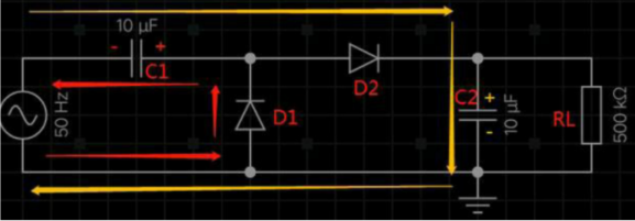 During the positive half cycle of the power supply, the voltage on the capacitor C1 superimposes the power supply voltage, so that the diode D2 is turned on, the diode D1 is turned off, the capacitor C2 is positive and the bottom is negative, and the peak voltage can reach twice the peak voltage of the power supply, that is, double the voltage.