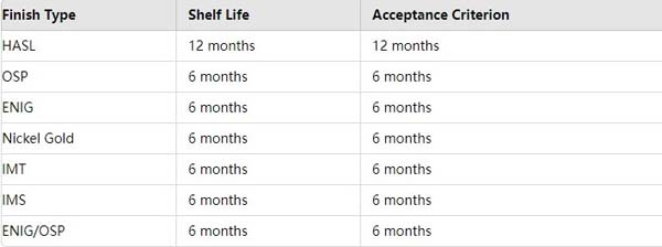 The following table outlines the shelf life and acceptance criteria for various PCB finishes:
