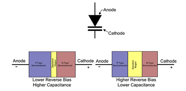 Figure 1: Varactor diodes provide variable capacitance based on the applied reverse bias. The higher the bias voltage level, the lower the capacitance. (Source: Digi-Key Electronics)