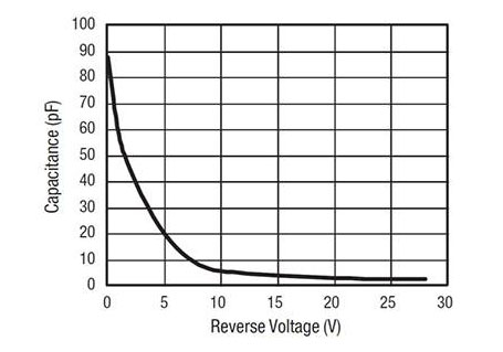 The capacitance of the varactor diode is inversely proportional to the applied DC bias. The higher the reverse bias voltage, the wider the depletion region of the diode, and therefore the lower the capacitance. In Skyworks Solutions’SMV1801-079LF hyperabrupt junction varactor diode capacitance and reverse bias curve, we can see this change graphically (Figure 2).