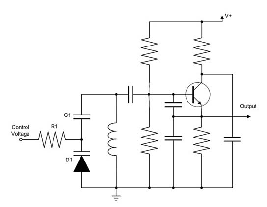 Figure 3: The varactor diode tuned oscillator alternating current coupling the varactor diode D1 to the oscillator through capacitor C1. This isolates the varactor diode D1 from the transistor bias and vice versa. The control voltage is applied through resistor R1. (Source: Digi-Key Electronics)