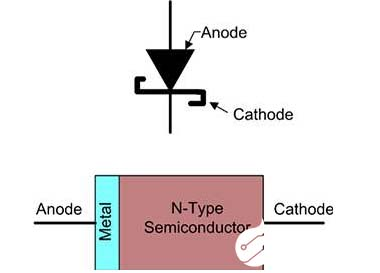 Figure 5: The physical structure of a Schottky diode is based on a metal-N-type semiconductor junction, and therefore has a very low forward voltage drop and extremely fast switching speed. (Source: Digi-Key Electronics)