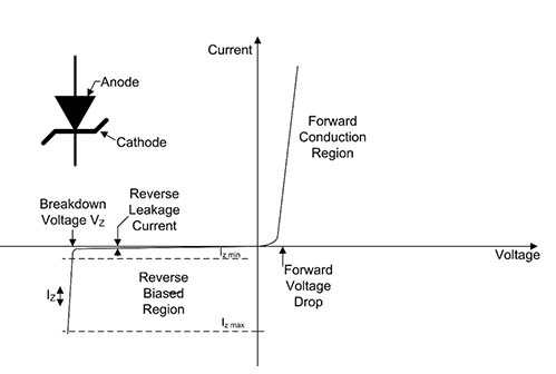 Figure 7: Schematic symbol of Zener diode and its current-voltage characteristic curve. Although the current-voltage characteristic of the Zener diode has a normal forward conduction region, but when reverse bias occurs, it will break down and maintain a constant voltage across the diode. (Source: Digi-Key Electronics)